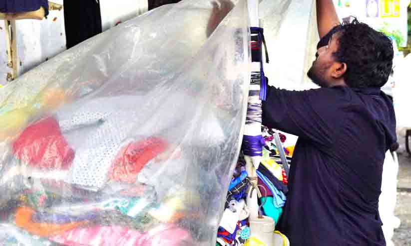 തിങ്കളാഴ്ച രാവിലത്തെ തെളിമാനം നോക്കി വഴിയരികിലേക്ക് സാധനങ്ങൾ ഇറക്കി കച്ചവടം തുടങ്ങിക്കഴിഞ്ഞപ്പോഴായിരുന്നു അപ്രതീക്ഷിതമായി മഴയുടെ വരവ്. പെട്ടെന്നുതന്നെ തുണിത്തരങ്ങൾ പ്ലാസ്റ്റിക് ഷീറ്റ് പുതപ്പിച്ച് നനയാതെ കാത്തു. ഉച്ചതിരിഞ്ഞെങ്കിലും മഴയൊഴിഞ്ഞേക്കുമെന്ന പ്രതീക്ഷയും തകർത്ത് മഴ തിമിർത്തപ്പോൾ കച്ചവടക്കാർക്ക് നിരാശയായി.