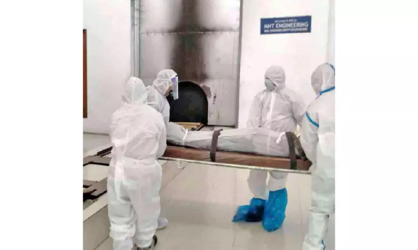text_fieldsകോവിഡ് ബാധിച്ച് മരിച്ചയാളുടെ മൃതദേഹം സന്നദ്ധ പ്രവർത്തകർ ദഹിപ്പിക്കുന്നു