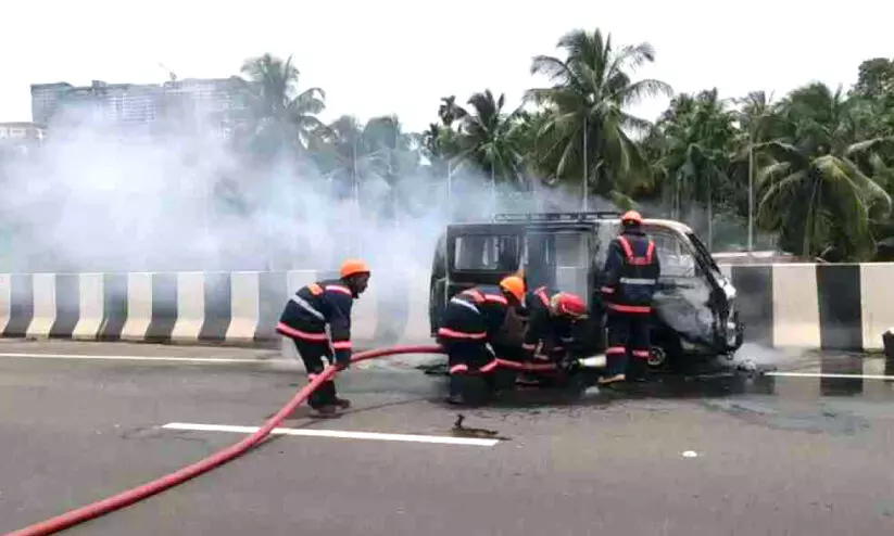 text_fieldsപാലാഴി മേൽപാലത്തിൽ അഗ്നിക്കിരയായ വാൻ അഗ്നിശമന സേന തീ അണക്കുന്നു