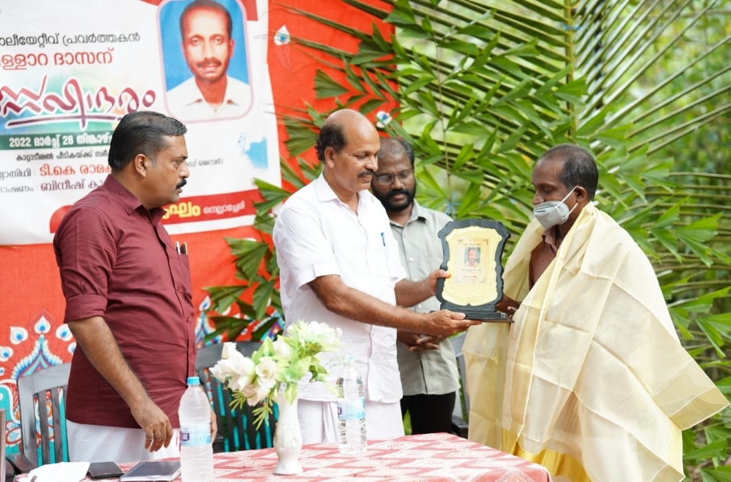 നെല്ലാച്ചേരി സഹൃദസംഘം പരിപാടിയിൽ ആശ്രയ പാലിയേറ്റീവ് പ്രവർത്തകൻ വെള്ളാറ ദാസനെ വാർഡ് മെമ്പർ ടി.കെ. രാമകൃഷ്ണൻ പൊന്നാടയണിയിച്ച് ആദരിക്കുന്നു