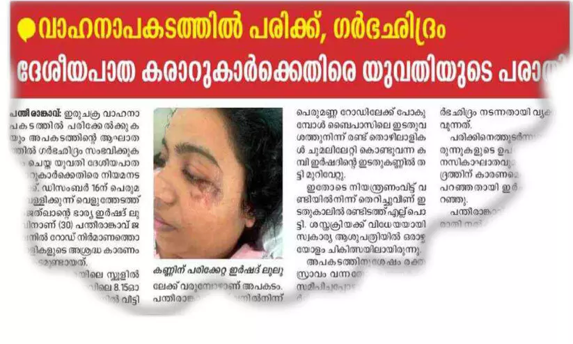 text_fieldsപന്തീരാങ്കാവ്: ദേശീയപാത നിർമാണത്തിനിടെ ജോലിക്കാരുടെ അശ്രദ്ധ കാരണം വാഹനാപകടത്തിൽ പരിക്കേറ്റ യുവതിക്ക് ഗർഭഛിദ്രമുണ്ടായ സംഭവത്തിൽ മനുഷ്യാവകാശ കമീഷൻ സ്വമേധയാ കേസെടുത്തു. കഴിഞ്ഞ ദിവസത്തെ ‘മാധ്യമം’ വാർത്തയെ തുടർന്നാണ് നടപടി. ജോലിക്കാർ ചുമലിലേറ്റി പോവുകയായിരുന്ന കമ്പി മുഖത്ത് കുത്തി ഒരു മാസം ഗർഭിണിയായ പന്തീരാങ്കാവ് സ്വദേശിനി ഇർഷദ് ലുലു (30) സ്കൂട്ടറിൽ നിന്നും വീഴുകയായിരുന്നു. കാലെല്ല് പൊട്ടി ശസ്ത്രക്രിയക്ക് വിധേയയായ യുവതിക്ക് ഗർഭഛിദ്രം സംഭവിച്ചു. ദേശീയപാത നിർമാണ കമ്പനി അപകടത്തിന് യുവതിയെ കുറ്റപ്പെടുത്തിയതിനെ തുടർന്ന് പന്തീരാങ്കാവ് പൊലീസിൽ പരാതി നൽകിയിരുന്നു.