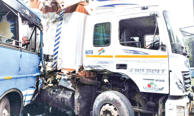 കണ്ടെയ്നർ ലോറി ബസിലിടിച്ചു; നിരവധി പേർക്ക് പരിക്ക്; ഒഴിവായത് വൻ ദുരന്തം