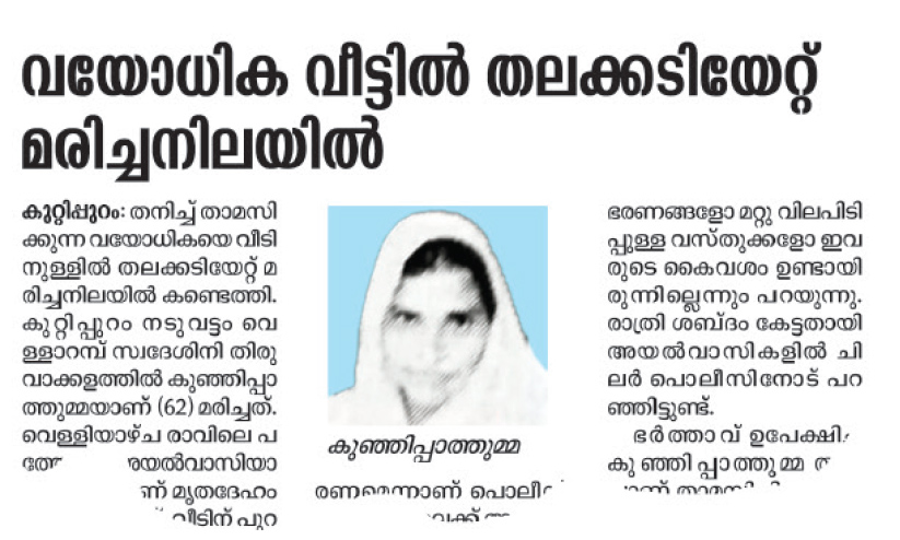 text_fieldsകുറ്റിപ്പുറം: തനിച്ച് താമസിച്ച വയോധിക തലക്കടിയേറ്റ് മരിച്ച സംഭവത്തിൽ പൊലീസ് അന്വേഷണം ഊർജിതമാക്കി. കുറ്റിപ്പുറം നടുവട്ടം വെള്ളാറമ്പ് സ്വദേശിനി കുഞ്ഞിപ്പാത്തുമ്മയാണ് മരിച്ചത്. പോസ്റ്റ്മോർട്ടം റിപ്പോർട്ടിൽ തലക്ക് ആഴമേറിയ നാല് മുറിവുകൾ സംഭവിച്ചിട്ടുണ്ട്. മാരക ആയുധനങ്ങൾ കൊണ്ട് ഏറ്റ മുറിവാണ് തലക്ക് സംഭവിച്ചത്.