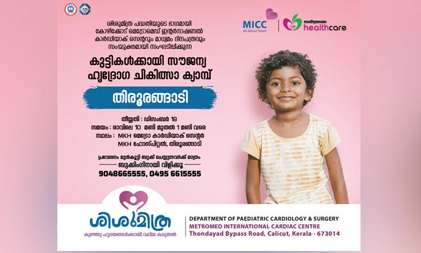 text_fieldsതിരൂരങ്ങാടി (മലപ്പുറം): മെട്രോമെഡ് ഇൻറർർനാഷണൽ കാർഡിയാക് സെൻററും മാധ്യമം ദിനപത്രവും ചേർന്ന് സംഘടിപ്പിക്കുന്ന 'ശിശുമിത്ര' സൗജന്യ ഹൃദ്രോഗ ചികിത്സാ നിർണയ ക്യാമ്പ് ഡിസംബർ 19ന് ഞായറാഴ്ച തിരൂരങ്ങാടി എം.കെ.എച്ച് ആശുപത്രിയിലെ മെട്രോ കാർഡിയാക് സെൻററിൽ നടക്കും. രാവിലെ 10 മുതൽ ഉച്ചക്ക് ഒന്ന് വരെയാണ് ക്യാമ്പ്.