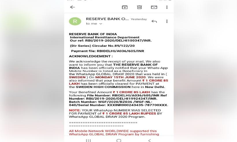 text_fieldsകരുവാരകുണ്ട്: വാട്സ്ആപ് നറുക്കെടുപ്പിൽ ജേതാവാണെന്ന് അറിയിച്ച് റിസർവ് ബാങ്കിെൻറ പേരിൽ തട്ടിപ്പിന് ശ്രമം. സ്വീഡനിൽ നടന്ന വാട്സ്ആപ് ഗ്ലോബൽ നറുക്കെടുപ്പിൽ വിജയിയാണെന്നും 1.85 കോടി രൂപക്ക് അർഹയാണെന്നും ഇ മെയിൽ വഴി അറിയിച്ചാണ് തട്ടിപ്പ്. നീലാഞ്ചേരി കിളിക്കുന്നിലെ തെച്ചിയോടൻ ലൈലാബിക്കാണ് കഴിഞ്ഞ ദിവസം ഇങ്ങനെ അറിയിപ്പ് വന്നത്. റിസർവ് ബാങ്ക് ഓഫ് ഇന്ത്യയുടെ ഇൻറർനാഷനൽ റെമിറ്റൻസ് ഡിപാർട്ട്മെൻറിൽ നിന്ന് എന്ന് പറഞ്ഞാണ് മെയിൽ വന്നിരിക്കുന്നത്.