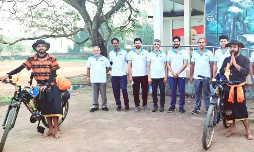 ഷിരൂരിൽനിന്ന് സൈക്കിളിൽ ശബരിമല യാത്ര; ചേളാരിയിൽ സൗഹൃദം പങ്കിട്ട് പ്രമോദും മണി രാജും
