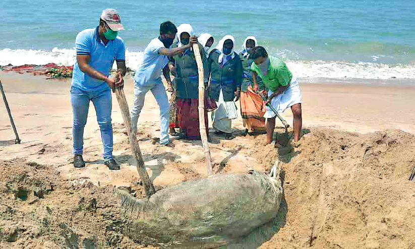 പടിഞ്ഞാറേക്കര ടൂറിസം ബീച്ചിൽ ചത്തടിഞ്ഞ ഭീമൻ ഡോൾഫിനെ ജീവനക്കാർ കുഴിച്ചുമൂടുന്നു