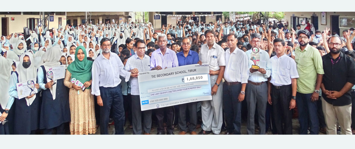 തിരൂർ: മാരകരോഗങ്ങളാൽ കഷ്ടപ്പെടുന്ന നിർധനർക്ക് സാന്ത്വനമേകുന്നതിന്റെ ഭാഗമായി 'മാധ്യമം' ഹെൽത്ത് കെയറിന്റെ 'വി കെയർ വി ഷെയർ' പദ്ധതിയിലേക്ക് തിരൂർ ടി.ഐ.സി സെക്കൻഡറി സ്കൂൾ വിദ്യാർഥികൾ സ്വരൂപിച്ച തുക കൈമാറി. അശരണർക്ക് കാരുണ്യത്തിന്റെ കൈത്താങ്ങായി സേവനത്തിന്റെ പാതയിൽ വിദ്യാർഥികളെ പ്രാപ്തരാക്കുക എന്ന ലക്ഷ്യത്തോടെയാണ് പദ്ധതി ആസൂത്രണം ചെയ്തതെന്ന് ടി.ഐ.സി സ്കൂൾ ചെയർമാൻ ഇബ്രാഹീം കോട്ടയിൽ പറഞ്ഞു. 1,68,850 രൂപ ഹെൽത്ത് കെയറിന് വേണ്ടി സ്വരൂപിക്കാൻ വിദ്യാർഥികൾക്ക് സാധിച്ചു.