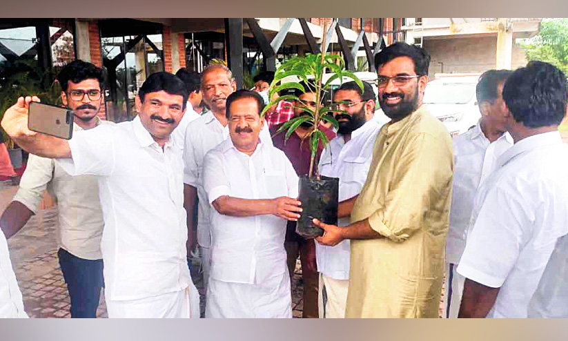 എം. നാരായണൻ മാവിൻ തൈ നൽകുന്നു