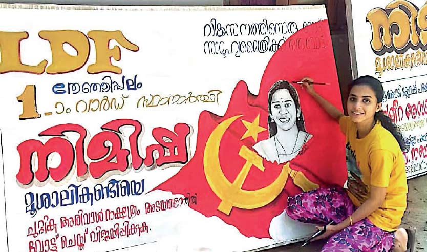 text_fieldsസ്ഥാനാർഥിയുടെ ചിത്രങ്ങൾ വരച്ച് പ്രചാരണ ബോർഡുകൾ തയാറാക്കുന്ന മൃദുല