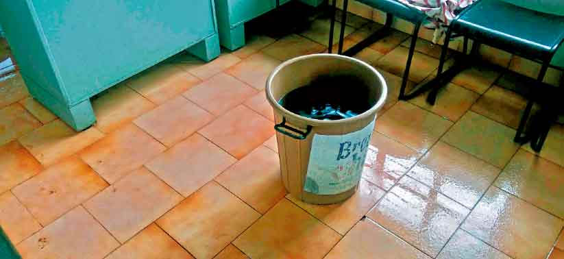 text_fieldsചോർന്നൊലിക്കുന്നതിനാൽ കാര്യാവട്ടം വില്ലേജ് ഓഫിസിനുള്ളിൽ സ്ഥാപിച്ച ബക്കറ്റ്