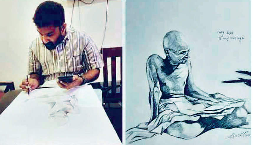 ചിത്രം വരച്ച് വി.ടി. ബല്റാമിന്റെ ഗാന്ധിസ്മരണ