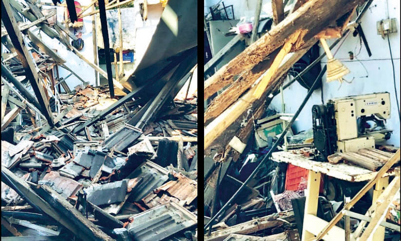 നണ്ടൻകിഴായ ആനമാറി റോഡിൽ പ്രവർത്തിക്കുന്ന സുകുമാരന്റെ ഉടമസ്ഥതയിലുള്ള ഫന്റാസ്റ്റിക് ബാഗ് നിർമാണ കേന്ദ്രം പ്രവർത്തിക്കുന്ന ഓടിട്ട കെട്ടിടത്തിന്റെ മേൽക്കൂരയാണ് വ്യാഴാഴ്ച അർധരാത്രി പൂർണമായി തകർന്നത്. രാത്രി പത്തുവരെ 15ലധികം തൊഴിലാളികൾ ഇവിടെ ജോലി ചെയ്തിരുന്നു.