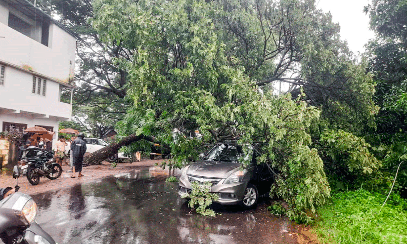 വേഴൂര്കുന്നില് വീടിനു മുകളിൽ തെങ്ങ് വീണു. തേറയില് മണികണ്ഠന്റെ വീടിന് മുകളിലേക്ക് അയല്വാസിയുടെ വളപ്പിലെ തെങ്ങാണ് കടപൊട്ടി വീണത്. വീടിന്റെ മുറ്റത്ത് നിന്നിരുന്ന വീട്ടമ്മ തെങ്ങ് വീഴുന്നത് കണ്ടതോടെ ഓടി മാറി. പാലക്കാട് കാക്കത്തറയിൽ കനത്ത മഴയിൽ വീട് തകർന്നുവീണു. ഇളയപുരക്കൽ സരോജിനിയുടെ വീടാണ് തകർന്നത്. പാലക്കാട് ആലത്തൂരിൽ കാറിനും സ്കൂട്ടറിനും മുകളിൽ മരം വീണു. സ്കൂട്ടർ യാത്രക്കാരൻ കാജയും കാർ യാത്രക്കാരനും അത്ഭുതകരമായി രക്ഷപ്പെട്ടു. ഇരുവാഹനങ്ങളും മരത്തിനടിയിൽ കുടുങ്ങി. ലക്കിടിയിൽ കോളനിപറമ്പ് വിലാസിനിയുടെ വീട് തകർന്നു.