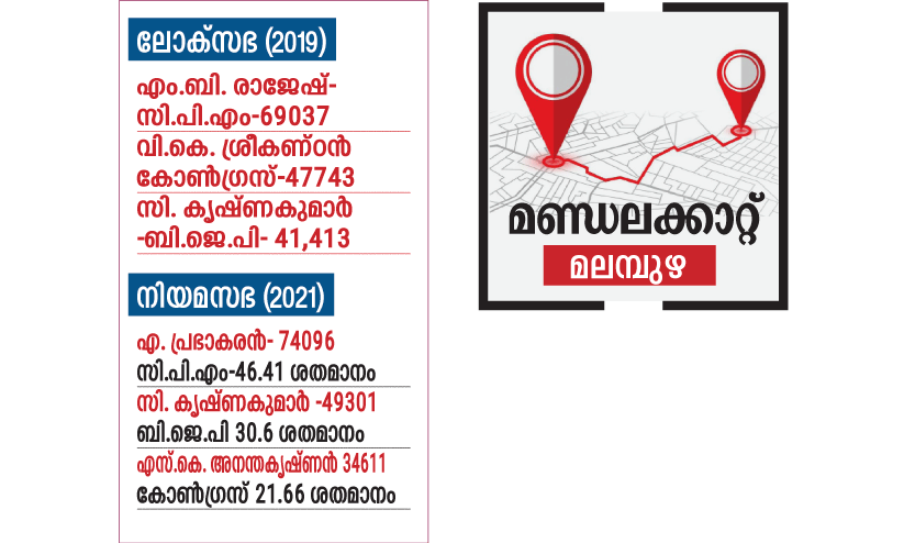 text_fieldsപാലക്കാട്: പരമ്പരാഗത ഇടതു-വലതു ചേരികൾക്കപ്പുറം ബി.ജെ.പിയുടെ വേരോട്ടമാണ് മലമ്പുഴ മണ്ഡലത്തിൽ ഏവരും ഉറ്റുനോക്കിക്കൊണ്ടിരിക്കുന്നത്. 2016െല നിയമസഭ ഫലത്തിൽ വി.എസ്. അച്യുതാനന്ദൻ 27000ൽപരം വോട്ടുകളുടെ ഭൂരിപക്ഷത്തിന് വിജയിച്ച തെരഞ്ഞെടുപ്പിൽ യു.ഡി.എഫിനെ ഞെട്ടിച്ച് ബി.ജെ.പി 10,000ൽപരം വോട്ടുകൾ അധികം നേടി രണ്ടാംസ്ഥാനത്തെത്തിയതായിരുന്നു മണ്ഡലത്തിലെ ശ്രദ്ധേയമായ സംഭവം. ലോക്സഭ, തദ്ദേശ തെരഞ്ഞെടുപ്പുകളിൽ യു.ഡി.എഫ് തിരിച്ചുവരവ് നടത്തിയെങ്കിലും മണ്ഡലത്തിൽ ഇന്ന് കാവിപ്പട നിർണായക ശക്തിയാണ്.