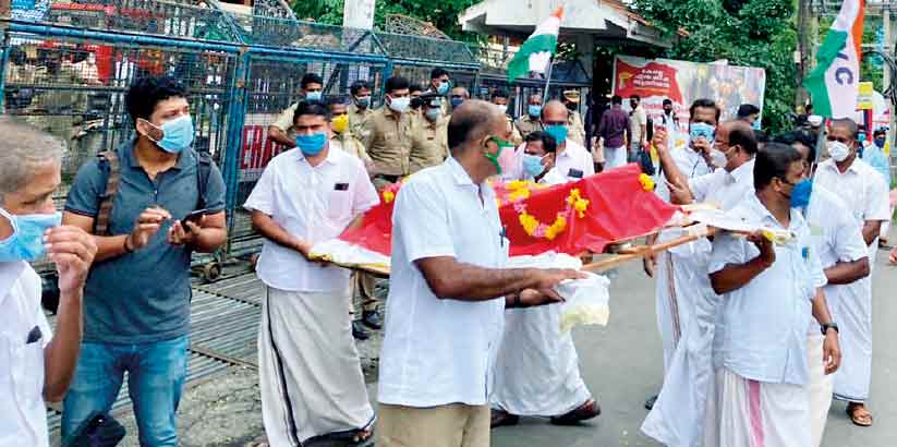 text_fieldsവ്യാപാരി വ്യവസായി കോൺഗ്രസ് ജില്ല കമ്മിറ്റി നടത്തിയ ശവമഞ്ച ഘോഷയാത്ര