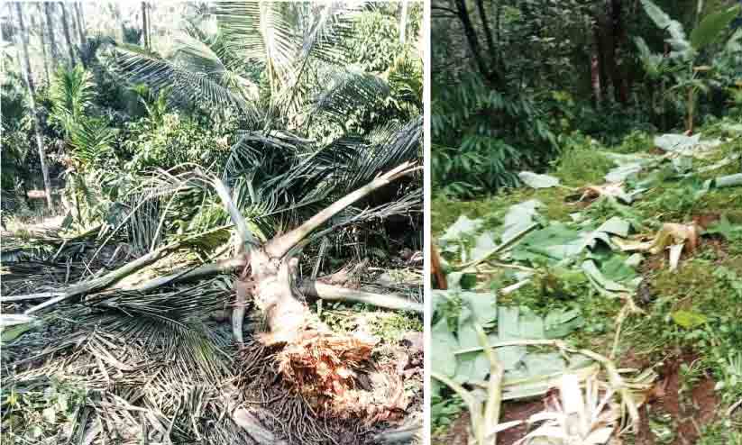 200 തെങ്ങ്, 500 വാഴ, 1000 കമുക്, റബർ, ജാതി, കുരുമുളക് എന്നിവ പിഴുതും ചവിട്ടിയും നശിപ്പിച്ച നിലയിലാണ്. മൂന്നേക്കർ സ്വദേശികളായ ടി.വി. ജോസഫ്, സാജൻ തെക്കുംപുറം, ജോസ് ചെറുപറമ്പിൽ, കുര്യൻ ചെറുപറമ്പിൽ, സിജു കുര്യൻ എന്നിവരുടെ തോട്ടങ്ങളിലാണ് കൂടുതൽ നാശം.