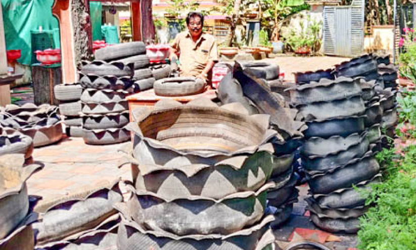 ജൈവകര്ഷകന് കടമ്പനാട് ശാന് നിവാസില് സി.കെ. മണിയുടെ വീട്ടുമുറ്റത്ത് ഇതിനായി ടയറുകള് ശേഖരിച്ച് അടുക്കി വെച്ചിരിക്കുകയാണ്. മണിയുടെ നേതൃത്വത്തിലുള്ള നാലംഗ സംഘമാണ് ചട്ടികള് ഉണ്ടാക്കുന്നത്. ഒരു ചട്ടി തയാറാക്കി ചായം പൂശി തീരുമ്പോള് 200-300 രൂപ ചെലവുവരുമെന്ന് മണി പറഞ്ഞു.