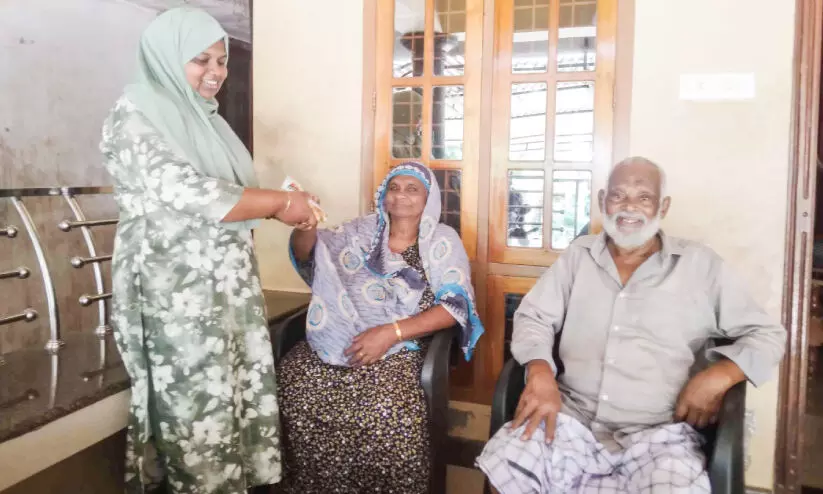 തസ്നി ഹുസൈന് ലഡു വിതരണം ചെയ്യുന്നു