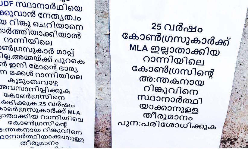 യു.ഡി.എഫ് സ്ഥാനാർഥിയെ പ്രഖ്യാപിക്കും മുമ്പേ റാന്നിയിൽ പോസ്റ്റർ യുദ്ധം