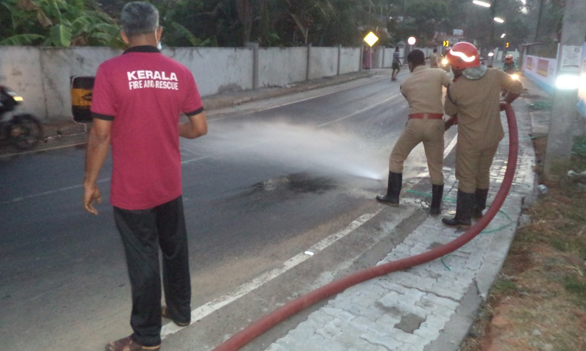 text_fieldsഓയിൽ റോഡിൽ പരന്നതിനെ തുടർന്ന് അഗ്നിശമന സേനയെത്തി റോഡ് കഴുകി വൃത്തിയാക്കുന്നു