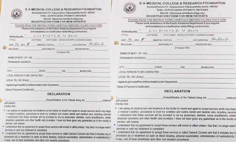 text_fieldsരോഗികൾ മതവും പാസ്പോർട്ട് നമ്പറും രേഖപ്പെടുത്തേണ്ട ശ്രീ അയ്യപ്പ മെഡിക്കൽ കോളജിലെ രജിസ്ട്രേഷൻ ഫോം