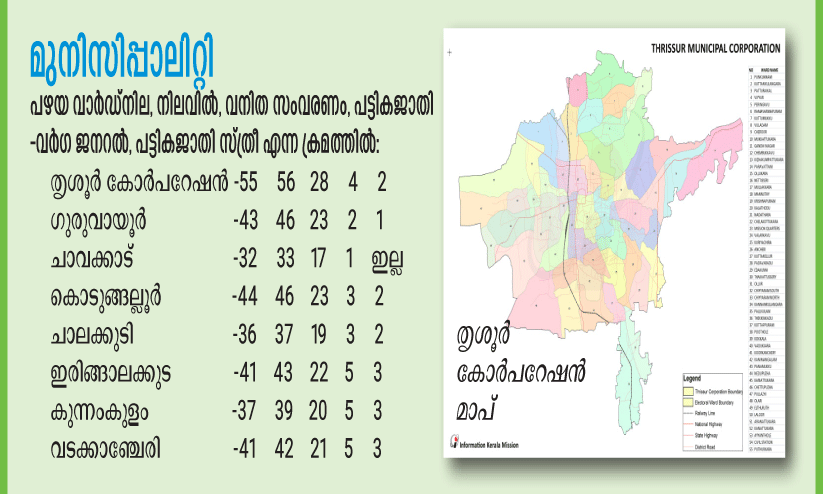 ചാവക്കാട് നഗരസഭയിൽ ആകെയുള്ള 33 വാർഡുകളിൽ 17 എണ്ണം വനിത സംവരണ വാർഡുകളായിരിക്കും. പട്ടികജാതി-പട്ടിക വർഗ സംവരണത്തിൽ ഒരു സീറ്റുണ്ടാകും. പട്ടികജാതി സ്ത്രീ സംവരണം ഉണ്ടാവില്ല. പുതിയ പരിഷ്കരണത്തിൽ പട്ടികജാതി വനിത സംവരണം ഇല്ലാത്ത ജില്ലയിലെ ഏക നഗരസഭയും ചാവക്കാട് ആണ്. കൊടുങ്ങല്ലൂർ നഗരസഭയിലെ 46 വാർഡുകളിൽ 23 വനിത സംവരണ വാർഡുകളും മൂന്ന് പട്ടിക ജാതി-പട്ടിക വർഗ ജനറൽ സംവരണ വാർഡുകളും ഉണ്ട്. ഇവിടെ രണ്ട് വാർഡുകൾ പട്ടിക ജാതി വനിത സംവരണ വാർഡുകൾ ആയിരിക്കും. ചാലക്കുടി നഗരസഭയിലെ 37 വാർഡുകളിൽ 19 വാർഡുകൾ വനിതാ സംവരണ വാർഡുകളാണ്. മൂന്ന് പട്ടികജാതി-പട്ടിക വർഗ ജനറൽ സംവരണ വാർഡുകളും രണ്ട് പട്ടികജാതി വനിതാ സംവരണ വാർഡുകളും ചാലക്കുടിയിൽ ഉണ്ടാകും. ഇരിങ്ങാലക്കുട നഗരസഭയിൽ 43ൽ 22 വാർഡുകളിൽ വനിതകൾ മത്സരിക്കും.