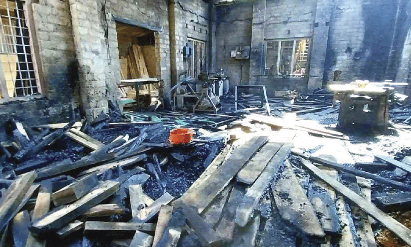 നെല്ലിക്കുളം ഡെൻസി തോമാസിന്റെ ഉടമസ്ഥതയിൽ 19 വർഷത്തോളമായി നല്ല നിലയിൽ പ്രവർത്തിക്കുന്ന സ്ഥാപനമാണ്. ആറ് ജീവനക്കാരുണ്ട്. ഫർണിച്ചറും കട്ടില, ജനൽ തുടങ്ങിയ വീട് നിർമാണ സാമഗ്രികളുമാണ് നിർമിക്കുന്നത്. തേക്ക് തുടങ്ങിയ വിലകൂടിയ മരങ്ങൾ ശേഖരിച്ച് വെച്ചിരുന്നു. ഞായറാഴ്ച അവധിയാണെങ്കിലും പകൽ സ്ഥാപനം വൃത്തിയാക്കാൻ ഉടമ സ്ഥലത്തെത്തിയിരുന്നു. വൈകീട്ട് അഞ്ചോടെയാണ് തിരിച്ചുപോയത്. തിങ്കളാഴ്ച പുലർച്ചെ സമീപത്തെ വീട്ടുകാരാണ് ഡെൻസി തോമസിനെ തീപടരുന്നതായി അറിയിച്ചത്. രണ്ട് മുറിയിലും തീ ആളിപ്പിടിച്ചിരുന്നു. മേൽക്കൂരയിലെ ഷീറ്റുകൾ തീ ആളിത്തകർന്നു.