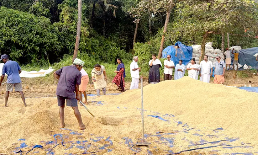 ചാലക്കുടി: പതിറ്റാണ്ടുകൾ തരിശായി കിടന്ന കാരക്കുളത്തുനാട് പാടശേഖരത്തിൽ അതിജീവനത്തിന്റെ ഭാഗമായി കുറച്ചു വർഷങ്ങളായി കൃഷി ഇറക്കുന്ന കർഷകരുടെ കഠിനാധ്വാന ഫലമായി വിളഞ്ഞ നെല്ല് അപ്രതീക്ഷിതമായി പെയ്ത മഴയിൽ വെള്ളത്തിലായി. 60 ഏക്കറോളം നെല്ല് ആധുനിക മെഷീൻ ഉപയോഗിച്ച് കൊയ്തു തുടങ്ങിയ അവസരത്തിലാണ് മഴ ചതിച്ചത്. 20 ഏക്കറോളം കൊയ്ത നെല്ല് മുഴുവൻ പാടശേഖരത്തിലാണ് സൂക്ഷിച്ചിരുന്നത്. അടുത്ത ദിവസം ചാക്കുകളിൽ നിറച്ച് ഏജൻസികൾക്ക് കൈമാറാനിരിക്കെയാണ് കനത്ത മഴയിൽ വെള്ളം കയറി ഭൂരിഭാഗം നെല്ലും നനഞ്ഞത്. നനയാത്ത നെല്ല് പണിക്കാരെ ഉപയോഗിച്ച് പരമാവധി ഉണക്കി ചാക്കിലാക്കുകയാണ് കർഷകർ.