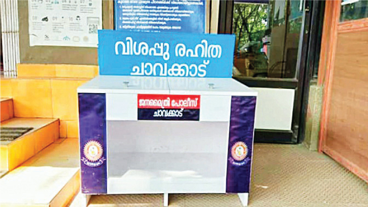 text_fields ചാവക്കാട് സ്റ്റേഷനു മുന്നിൽ ഉച്ചയൂണ് പദ്ധതിക്ക് പൊലീസ് സ്ഥാപിച്ച ഫുഡ് ബാങ്ക് ബോക്സ്