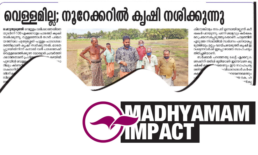 ഇതേതുടർന്ന് ചാലക്കുടി ലിഫ്റ്റ് ഇറിഗേഷൻ അസി. എൻജിനീയർ ഷാജിയും സംഘവും സ്ഥലത്തെത്തി ഭാരതപ്പുഴയിലെ പമ്പ് ഹൗസിലെ മോട്ടർ ശരിയാക്കി കർഷകർക്ക് വെള്ളം എത്തിക്കുകയായിരുന്നു.