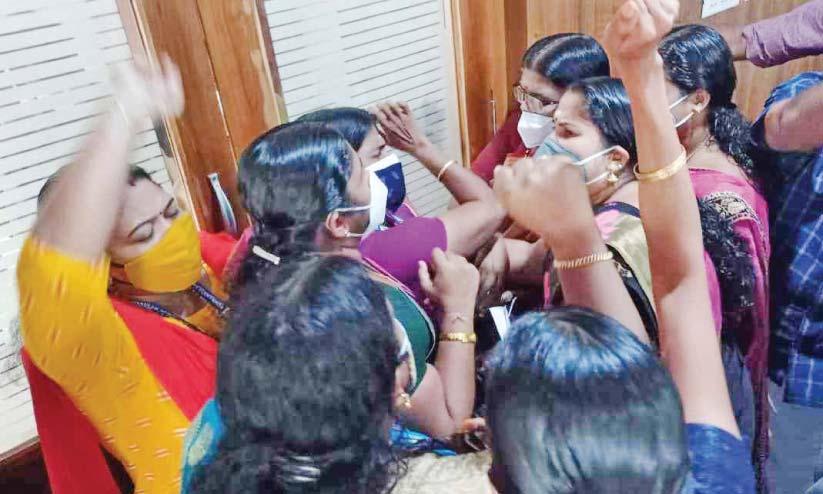 ഇറങ്ങിപ്പോകാൻ ശ്രമിക്കുമ്പോൾ ബി.ജെ.പി അംഗങ്ങൾ തടയുന്നു