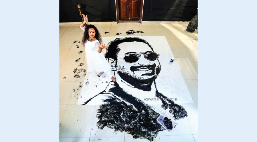 എട്ടടി വലുപ്പമുള്ള തുണിയില് അക്രിലിക് കളര് ഉപയോഗിച്ചായിരുന്നു അശ്വതി കൃഷ്ണയുടെ ഇന്ദ്രജാലം. നര്ത്തകിയും ചിത്രകാരിയുമായ അശ്വതി നൃത്തവും ചിത്രകലയും കൂട്ടിച്ചേര്ത്ത് പാദം ഉപയോഗിച്ച് സ്റ്റെന്സില് രൂപത്തിലാണ് ഫഹദിെൻറ ചിത്രം വരച്ചത്. ഒരു മണിക്കൂര് എടുത്ത് വീടിെൻറ മുകളിലെ സിറ്റൗട്ടില് െവച്ചാണ് ഈ ചിത്രം രൂപകൽപന ചെയ്തത്.