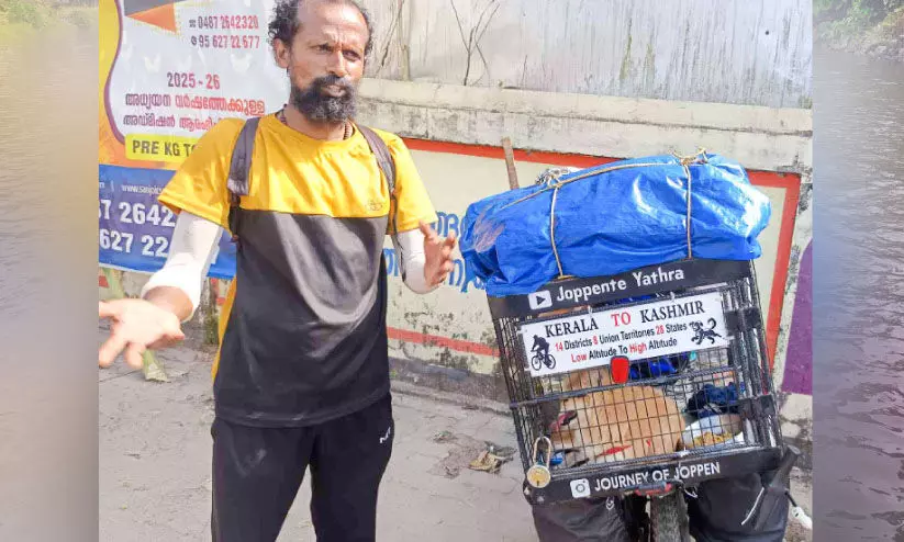 പാവറട്ടി: സൈക്കിളിൽ വീട്ടിലെ വളർത്തുനായ ‘കുഞ്ഞി’യുമായി കോട്ടയം സ്വദേശിയായ യുവാവിന്റെ ഇന്ത്യൻ പര്യടനം. കോട്ടയം ഏറ്റുമാനൂർ സ്വദേശി കളരിക്കൽ വീട്ടിൽ ജോപ്പനാണ് (38) യാത്രക്കിറങ്ങിയത്. ഒക്ടോബർ 27നാണ് ജോപ്പൻ നായക്കൂട് സൈക്കിളിനു പിന്നിൽ കെട്ടിവെച്ച് യാത്ര തുടങ്ങിയത്.