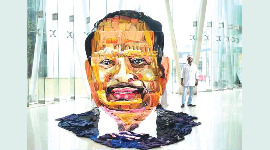 കൊടുങ്ങല്ലൂർ: മാളിലെ കടകളിൽനിന്നുള്ള വിവിധ സാധനങ്ങൾ കൊണ്ട് പ്രമുഖ വ്യവസായി എം.എ. യൂസുഫലിയുടെ ത്രിമാനചിത്രമൊരുക്കി ചിത്രകാരൻ ഡാവിഞ്ചി സുരേഷ്. നഗരത്തിലെ സെൻട്രോ മാളിന് മുന്നിലാണ് യൂസുഫലിക്ക് ആദരമായി ചിത്രമൊരുക്കിയത്. തുണിത്തരങ്ങൾ, സ്റ്റേഷനറി സാധനങ്ങൾ, ബാഗ്, ചെരിപ്പ്, വിവിധ അലങ്കാര വസ്തുക്കൾ എന്നിവ ഉപയോഗിച്ച് 12 മണിക്കൂർ കൊണ്ടാണ് 12 അടി ഉയരവും 25 അടി നീളവുമുള്ള ചിത്രം തയാറാക്കിയത്.