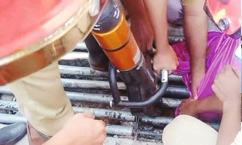 ഗ്രിൽ റോളറിനിടയിൽ കുടുങ്ങിയ പെൺകുട്ടിയുടെ കാൽ പുറത്തെടുക്കുന്നു