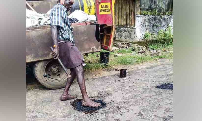 തകർന്ന പോന്നോർ ആളൂർ റോഡിൽ കാല് കൊണ്ട് അമർത്തി കുഴിയടക്കുന്നു