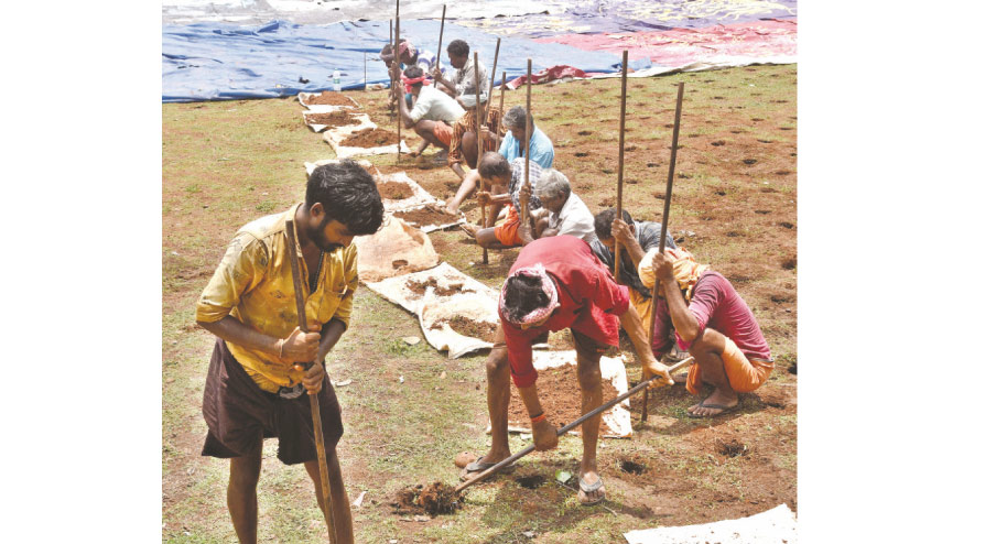 text_fieldsതൃശൂർ പൂരത്തിന്റെ പ്രധാന ആകർഷണമായ വെടിക്കെട്ടിനായി തേക്കിൻകാട് മൈതാനിയിൽ കുഴികളൊരുക്കുന്ന തൊഴിലാളികൾ. മഴ ഭീഷണിമൂലം കുഴികളിൽ വെള്ളമിറങ്ങാതിരിക്കാൻ ടാർപോളിൻ വിരിച്ചിരിക്കുന്നതും കാണാം
