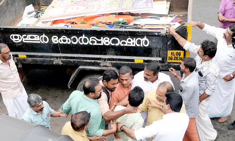 text_fieldsകഴിഞ്ഞ ജനുവരി ഒന്നിന് തൃശൂരിൽ പ്രധാനമന്ത്രി നരേന്ദ്രമോദിയുടെ റോഡ് ഷോയുടെ പ്രചാരണാർഥം സ്വരാജ് റൗണ്ടിൽ സ്ഥാപിച്ച ബോർഡുകൾ അഴിച്ചുമാറ്റാനെത്തിയ കോർപറേഷൻ ജീവനക്കാരന്റെ കഴുത്തിൽ പിടിക്കുന്ന ബി.ജെ.പി പ്രവർത്തകർ (ഫയൽ ഫോട്ടോ: ടി.എച്ച്. ജദീർ)