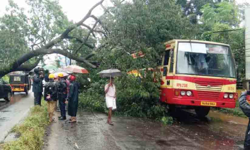 കൈപറമ്പിൽ കെ.എസ്.ആർ.ടി.സി ബസിന് മുകളിലേക്ക് മരം കടപുഴകിയ നിലയിൽ