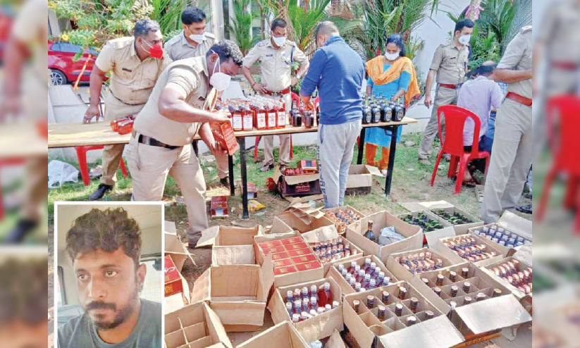 text_fieldsപിടികൂടിയ മദ്യം പൊലീസ് പരിശോധിക്കുന്നു. ഇൻസെറ്റിൽ അറസ്റ്റിലായ ജേക്കബ്.