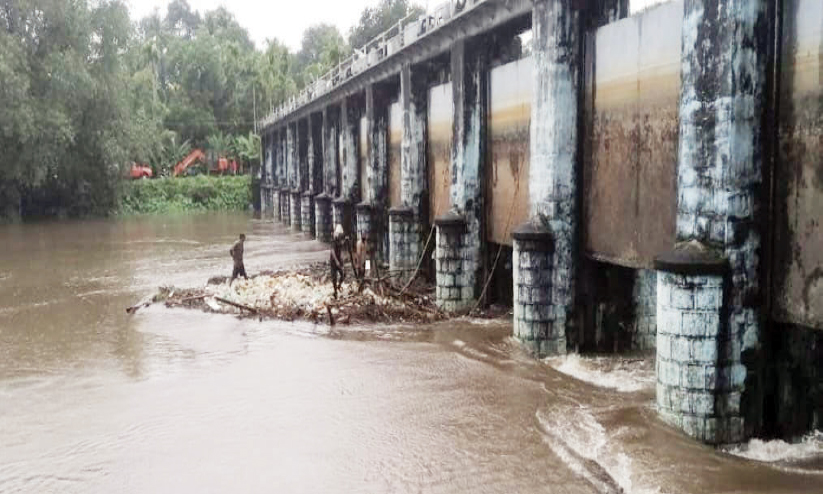 ഇല്ലിക്കൽ ഡാമിന്റെ ഷട്ടറുകളിൽ തടഞ്ഞുനിന്ന വന്മരങ്ങൾ നീക്കുന്നു