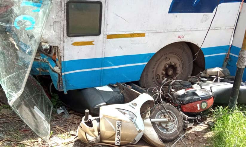 ഞായറാഴ്ച രാവിലെ 11 ഓടെയാണ് നെയ്യാറ്റിൻകര ഡിപ്പോയിൽനിന്ന് തിരുവനന്തപുരം ഭാഗത്തേക്കുപോയ ബസ് അപകടത്തിൽപെട്ടത്. രണ്ടു ബൈക്കുകളെയും ഒരു വഴിയാത്രക്കാരിയെയും ഇടിച്ചിട്ടു. സംഭവത്തിൽ ഗുരുതര പരിക്കേറ്റ മൂന്നുപേരെ മെഡിക്കൽ കോളജ് ആശുപത്രിയിലും മറ്റുള്ളവരെ നെയ്യാറ്റിൻകരയിലെ സ്വകാര്യ ആശുപത്രിയിലും പ്രവേശിപ്പിച്ചു. സ്കൂട്ടർ യാത്രക്കാരായ ആലുവിള കാട്ടുവിള പുത്തൻവീട്ടിൽ മഞ്ജു(28), പാപ്പനംകോട് സ്വദേശി വിപിൻ(35), കാൽനട യാത്രക്കാരിയായ കാവുവിള സ്വദേശി രാജം എന്നിവരാണ് മെഡിക്കൽ കോളജ് ആശുപത്രിയിൽ ചികിത്സയിലുള്ളത്. ബസ് ൈഡ്രവർ കോഴിക്കോട് സ്വദേശി അബ്്ദുൽ സലാം, വനിത കണ്ടക്ടർ ഓലത്താന്നി സ്വദേശി ഷൈനി എന്നിവർക്കും പരിക്കേറ്റു. നിസ്സാര പരിക്കേറ്റ ബസ് യാത്രക്കാരായ പത്തോളം പേരും ചികിത്സ തേടി.