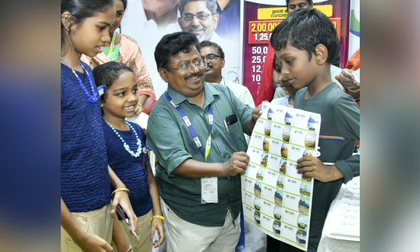 കെ.എസ്.എഫ്.ഇ പവലിയനിൽ കുട്ടികൾക്ക് സമ്മാനങ്ങൾ വിതരണം ചെയ്യുന്ന സീനിയർ മാനേജരും സിനിമ താരവുമായ ജോബി