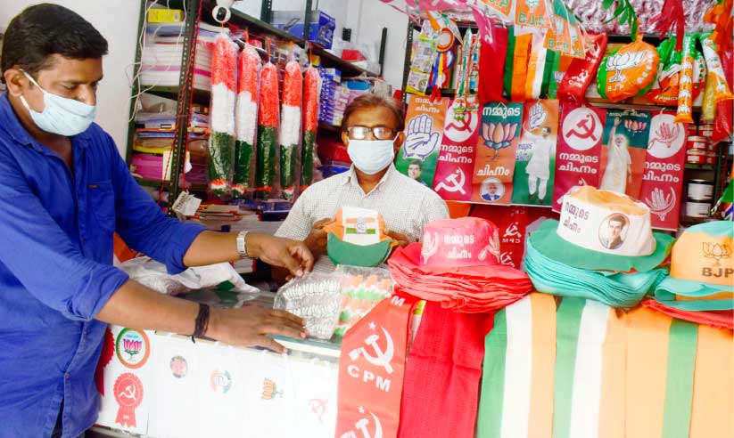 സി.പി.എം, കോൺഗ്രസ്, ബി.ജെ.പി പാർട്ടികളുടെ കൊടികളാണ് ഇവിടത്തെ പ്രധാനയിനം. സൂറത്ത്, ഇൗറോഡ് എന്നിവിടങ്ങളിലെ വമ്പൻ പ്രിൻറിങ് ഫാക്ടികളിൽ തയാറാക്കുന്ന കൊടികളാണിവ. വലിയ ഡിമാൻറാണ് സാധാരണ കൊടികൾക്ക്. പൊതുയോഗങ്ങൾക്കും പദയാത്രകൾക്കും മറ്റും നിയന്ത്രണങ്ങളുള്ളതിനാൽ കൊടിക്കച്ചവടം അത്ര സജീവമായിട്ടില്ല. പാർട്ടി ഒാഫിസുകളും പ്രചാരണ കമ്മിറ്റി ഒാഫിസുകളുമെല്ലാം അലങ്കരിക്കാനാണ് ഇപ്പോൾ പ്രധാനമായും കൊടിതോരണങ്ങൾ വാങ്ങുന്നത്. ഷാളുകളുടെയും സ്ഥിതി വ്യത്യസ്തമല്ല. സ്ഥാനാർഥി സ്വീകരണ പരിപാടികളില്ലാത്തതിനാൽ ഷാളുകൾക്കും ചെലവ് കുറവാണ്. അതേസമയം തൊപ്പികൾക്ക് ആവശ്യക്കാരുണ്ട്. സ്ഥാനാർഥികളുടെയും നേതാക്കളുടെയും ചിത്രങ്ങൾ കൊത്തിയ തൊപ്പികളാണ് ഇപ്പോൾ ട്രെൻഡ്. ചെെന്താപ്പിയും ത്രിവർണതൊപ്പിയും കാവിത്തൊപ്പിയുമെല്ലാം ഇവിടെയുണ്ട്.