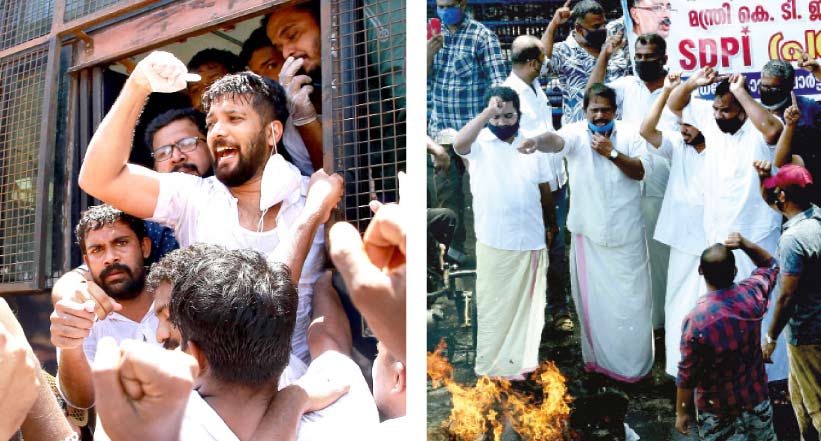 text_fields1. യൂത്ത് കോൺഗ്രസ് സംസ്ഥാന പ്രസിഡൻറ് ഷാഫി പറമ്പിൽ, കെ.എസ്. ശബരീനാഥൻ തുടങ്ങിയവരെ അറസ്റ്റ് ചെയ്യുന്നു 2.മന്ത്രി കെ.ടി. ജലീൽ രാജിവെക്കണമെന്നാവശ്യപ്പെട്ട് എസ്.ഡി.പി.ഐ സെക്രേട്ടറിയറ്റിന് മുന്നിൽ നടത്തിയ പ്രതിഷേധം