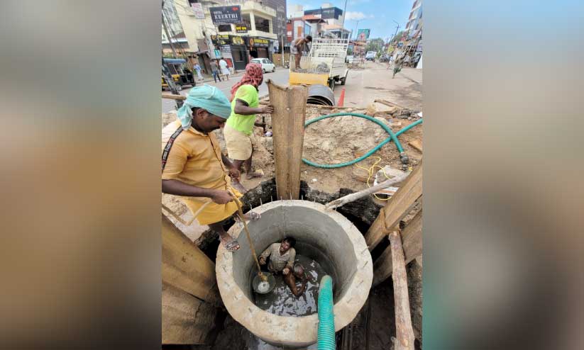 റോഡിൽനിന്ന് മൂന്ന് മീറ്ററോളം താഴ്ചയിൽ കുഴിയെടുത്ത് നേരത്തെ സ്ഥാപിച്ചിട്ടുള്ള 100 എം.എം പൈപ്പിൽ ബന്ധിപ്പിക്കലാണ് ജോലി. മണ്ണ് കൊണ്ടും കല്ലുകൊണ്ടും നിർമിച്ചവയാണ് തകർന്ന ഈ രണ്ടെണ്ണവും. 1.20 മീറ്റർ ഉള്ളളവിൽ കോൺക്രീറ്റിൽ മാൻഹോൾ പണിതാണ് താഴെ ലൈനിലേക്ക് ബന്ധിപ്പിക്കുന്നത്.