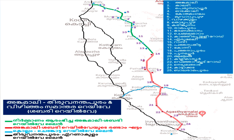 ശബരി പദ്ധതിക്കായി അങ്കമാലിമുതൽ കാലടിവരെ എട്ടുകിലോമീറ്റർ ട്രാക്കും കാലടി റെയിൽവേ സ്റ്റേഷനും പെരിയാർ റെയിൽവേ പാലവും നിർമിച്ചുകഴിഞ്ഞു. ശബരി റെയിൽവേക്കായി നടപ്പ് സാമ്പത്തികവർഷം 100 കോടി രൂപ ബജറ്റിൽ കേന്ദ്ര സർക്കാർ വകയിരുത്തിയിട്ടുണ്ട്. പുതുക്കിയ എസ്റ്റിമേറ്റ് റെയിൽവേ ബോർഡിന്റെ പരിശോധനക്കായി ദക്ഷിണ റെയിൽവേ സമർപ്പിച്ചിരിക്കുകയാണ്. സംസ്ഥാന സർക്കാർ മുൻകൈയെടുത്ത് അങ്കമാലി-ശബരി റെയിൽവേയെ വിഴിഞ്ഞം തുറമുഖത്തേക്കും തലസ്ഥാനത്തേക്കുമുള്ള രണ്ടാമത്തെ റെയിൽവേ കോറിഡോറായി വികസിപ്പിക്കണമെന്നാണ് ആവശ്യം.
