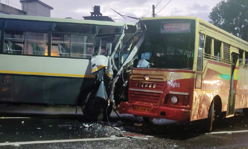 ബാലരാമപുരം: തിരുവനന്തപുരം ഭാഗത്ത് നിന്ന് പാറശ്ശാല ഭാഗത്തേക്ക് വി.എസ്.എസ്.സിയിലെ ജീവനക്കാരെ വിളിക്കുന്നതിനായി പോയ ബസും പാറശ്ശാല ഡിപ്പോയിൽ നിന്നും കൊട്ടാരക്കരയിലേക്ക് പോയ ബസുമാണ് കൂട്ടിയിടിച്ചത്. ഇടിയുടെ ആഘാതത്തിൽ രണ്ട് ബസുകളുടെയും മുൻവശം പൂർണമായും തകർന്നു.