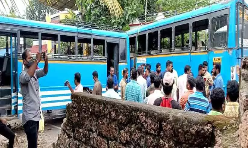 കൂട്ടിയിടിയുടെ ആഘാതത്തില് രണ്ട് ബസുകളും നിയന്ത്രണം തെറ്റി സമീപത്തെ മതില് തകര്ത്തു കയറിയാണ് നിന്നത്. ബസ് മതിൽ തകർത്ത് ഇടിച്ചുകയറുമ്പോൾ വീട്ടുമുറ്റത്ത് ആളില്ലാതിരുന്നതും ദുരന്തം ഒഴിവാക്കി.